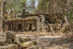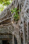The vast courtyard leading up to the temple was not expected and contained several smaller buildings with a current vendor encampment of stalls on the north side. The scale and grandeur of the entire site was impressive. The quality and preservation of the bas-reliefs and carvings was incredible and visually rewarding. I took hundreds of pictures working my way through the complex. The line to get up the stairs at the main temple was about 100 people long and moving very slowly, so will get that view as well as others missed on my next visit. Incredibly hot and thirsty, I headed out the east gate along a treed jungle road. The views looking back were great. I reached the parking area, found my driver and enjoyed a cold beverage and the cold AC as we took off for Ta Prohm, the Temple of Rocks and Roots. (Actually “Ancestor of Brahma”) Ta Prohm is the site where you see the massive Banyan Tree roots engulfing and in some cases destroying the structures. Built during King Jayavarman VII’s reign, 1181-1201 it was a powerful wealthy Buddhist Temple. The French chose to minimize restoration in the 19th century and much of the site remains as they found it. This time I am let out at the east gate with pickup on the west side. I am sufficiently cooled down and grab some water and head out.