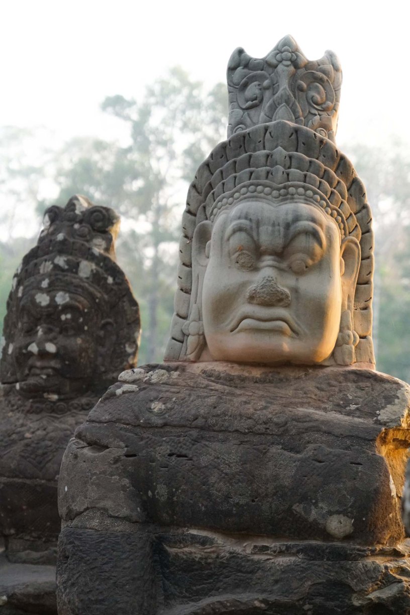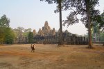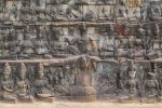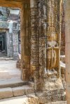 5AM came too soon as I just fell asleep around 4AM. Breakfast, grabbed my pack and headed out for Angkor Thom, the “Great City.” Light was good as we got to the huge complex. Entered on the south side over a bridge lined with warriors through a gate with the large faces that are symbolic of the Bayon Temple. We parked across the road from Bayon on the southwest side and I headed out across a field to the west entrance. This complex is huge with multiple temples and structures. Also built during the reign of Jayavarman VII, the complex covers almost 4sq. miles. I never would have made it through this site in the heat of the day yesterday. The many towers of Banyon Temple have 4 smiling faces looking towards the 4 cardinal directions of east, west, north and south. Very few visitors at this time of day and I make the most of the photo opportunities. Great bas reliefs all through the multiple heights that are obtainable. My favorite site so far. There are major New Years preparations underway with an alter set up on the Bayon south gate and across the road multiple stages are going in a big field. I walk back to the car and we head down the road where I take in the Terrace of the Elephants and the Terrace of the Leper King which is the more interesting of the two terraces with amazing bas reliefs. I satisfy my curiosity with the area and we head out for Preah Khan as the heat begins to build.